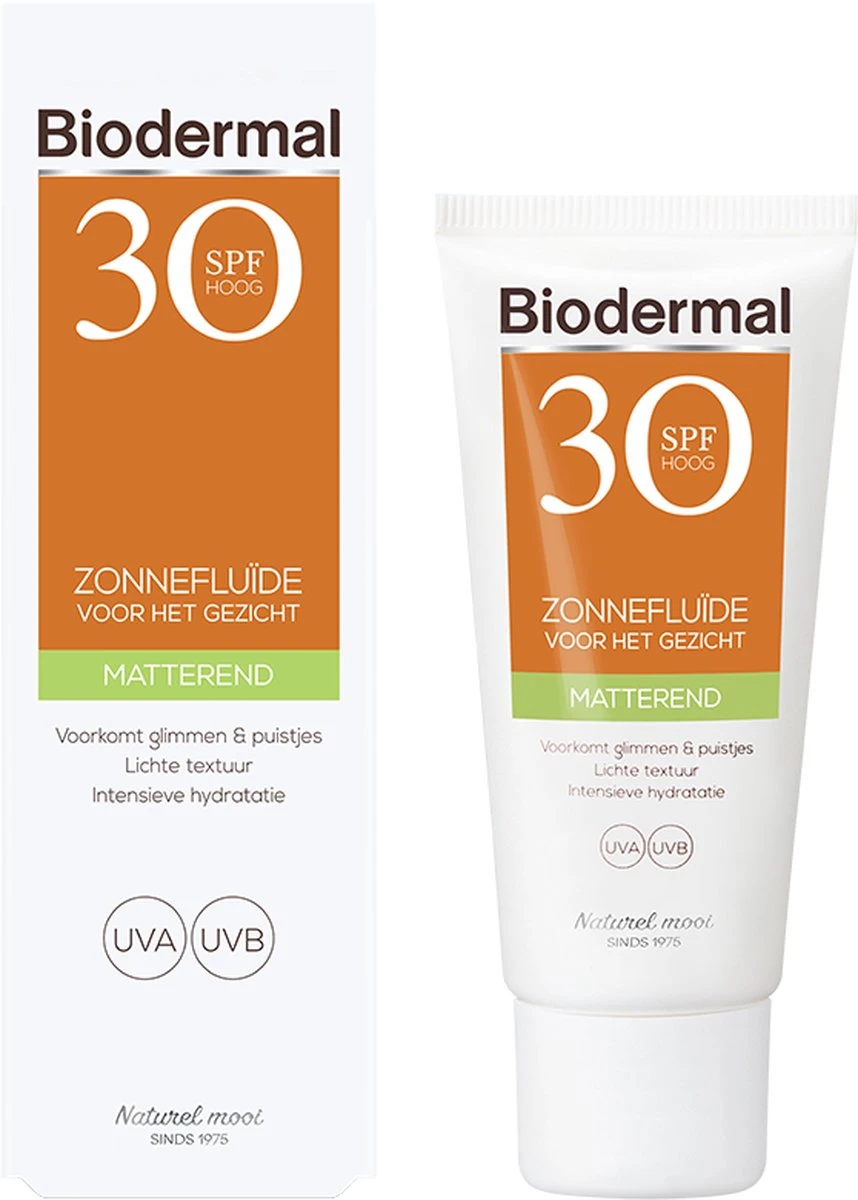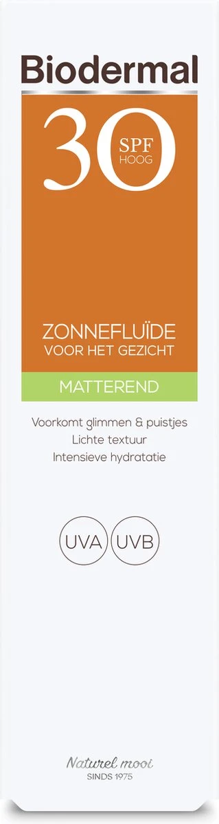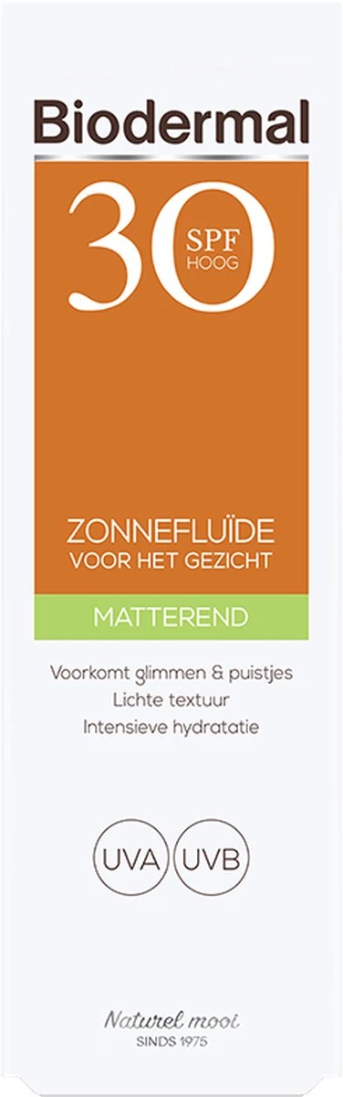Biodermal gezicht matterende Zonnefluïde SPF 30 is speciaal ontwikkeld voor het gezicht. De zonnefluide bevat geavanceerde UVB-/UVA-filters voor een directe en aanhoudende bescherming.De lichte, zeer waterbestendige formule is matterend en laat geen glans achter op de huid. Bevat een combinatie aan ingrediënten die de huid hydrateert en puistjes helpt voorkomen. Deze zonnefluide is geschikt voor de normale tot gemengde huid en kan onder make-up aangebracht worden.