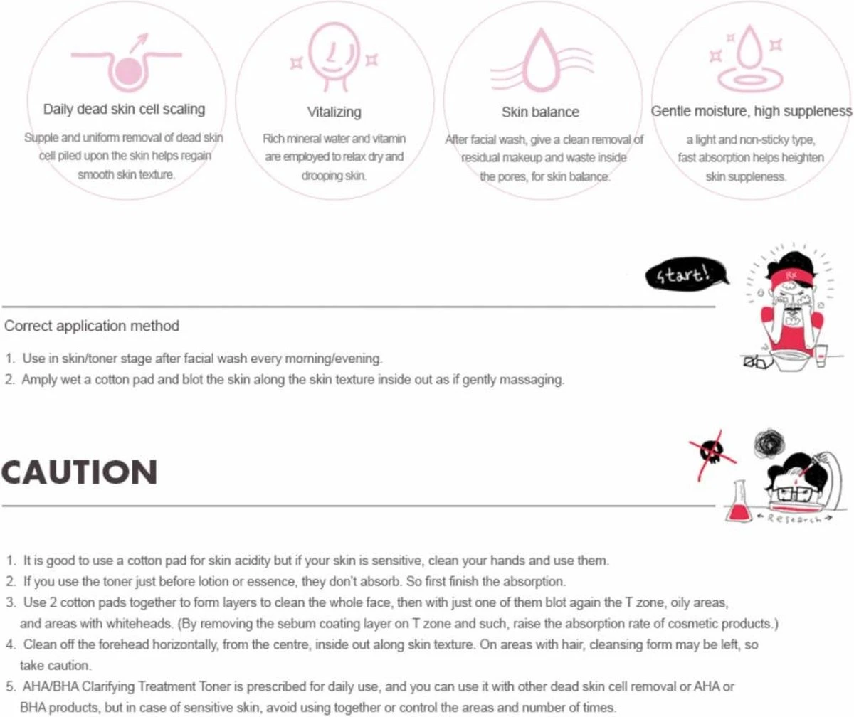 | Voorzorgsmaatregelen | Week een katoen met een paar druppels van de toner of gebruik gewoon je handen in plaats van het katoen. Dep zachtjes op je gezicht en hals tot ze volledig zijn opgenomen. |