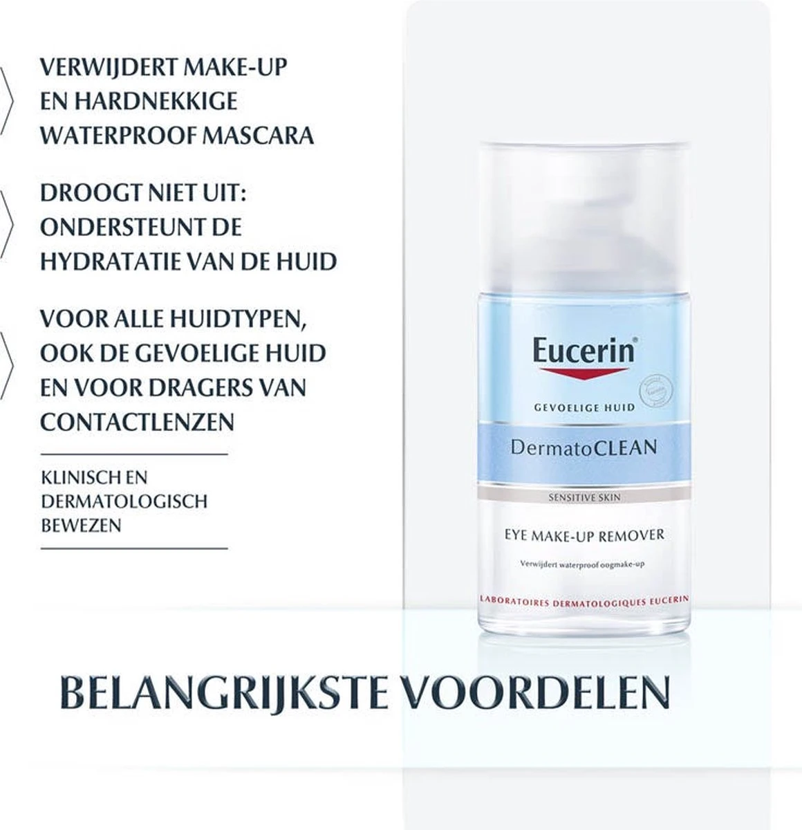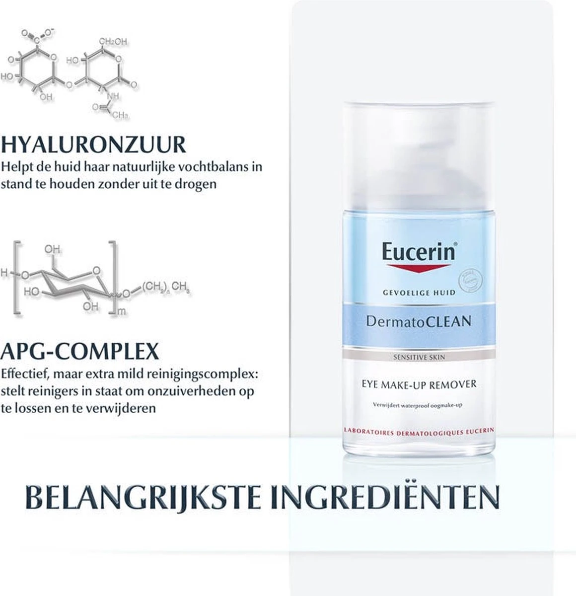 Eucerin DermatoCLEAN Oogreinigingslotion voor Waterproof Make-up:br /•Verwijdert oogmake-up op milde wijze, zelfs hardnekkige waterproof mascara.br /•Laat de gevoelige huid rond de ogen beter ademen.br /•Is getest op en is bewezen geschikt voor de gevoelige huid en de ogen.br /br / Een niet vette, tweefasenformule met:br /•een bovenlaag om waterbestendige make-up te verwijderen.br /•een onderlaag om in water oplosbare make-up te verwijderen.br / Vóór gebruik schudden om te mengen en te activeren.br /br / Een innovatieve reinigingslotion met de combinatie van actieve ingrediënten:br /•APG-complex: een natuurlijk, extra mild reinigingscomplexbr /•Gluco-glycerol: een vochtinbrengend actief bestanddeel waarvan klinisch is bewezen dat dit helpt bij het behoud van de natuurlijke vochtbalans van de huid.br /•Hyaluronzuur: een actief bestanddeel voor huidverzorging met een groot vochtvasthoudend vermogen.br /br /Resultaat: de ogen, wimpers en de huid rond de ogen voelen grondig gereinigd en gehydrateerd aan.