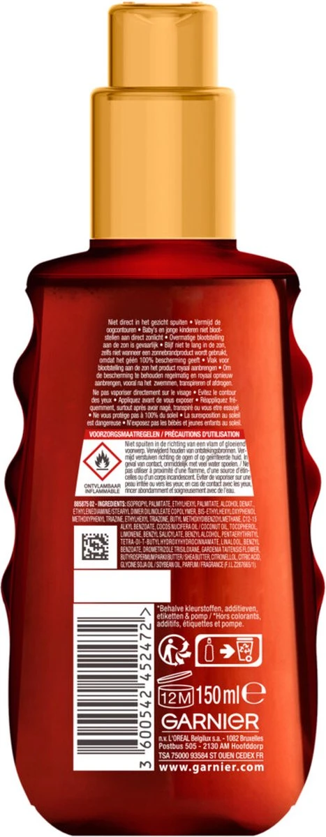Wil je jouw zongebruinde huid een tijdje behouden? De Garnier Ambre Solaire Zonnebrandolie SPF 30 helpt jou bij het verkrijgen van een diepe, langdurige teint. De olie voedt de huid zonder vettig en plakkerig aan te voelen. Voor de optimale bruining. Plakt niet, waterresistent en voor een zachte hud.