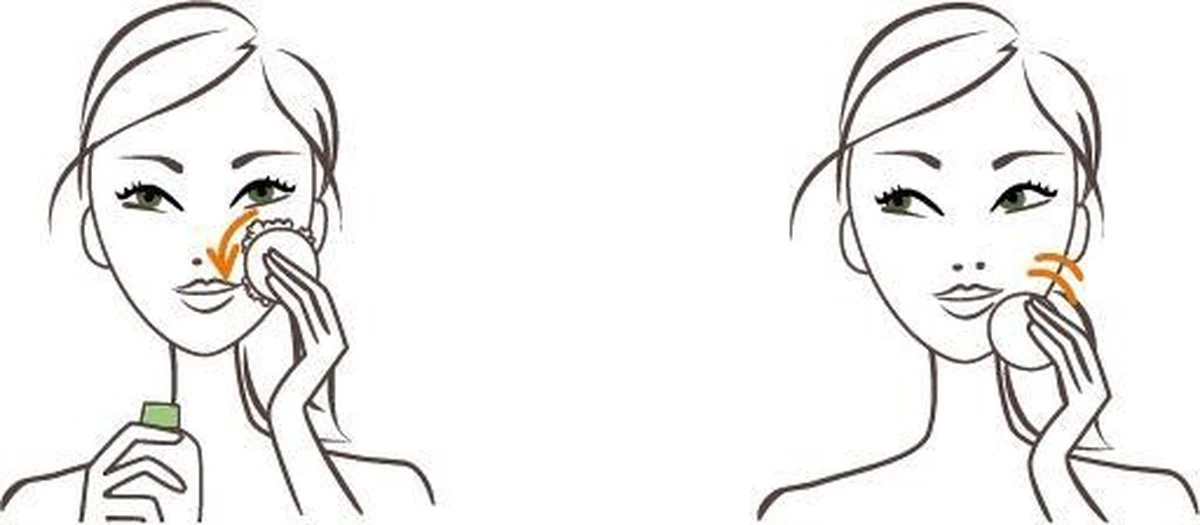 4: Reinig de gezichtshuid Haal het wattenschijfje met micellair reinigingswater over je gehele gezicht. Begin aan de buitenkant rondom je gezicht, ga dan richting de wangen, het voorhoofd en eindig met de hals! Maak de juiste beweging: Van de hals, naar de bovenkant van het gezicht, en vervolgens van de neus richting de oren. Gebruik iets meer druk op de T-zone: voorhoofd, neus en kin.