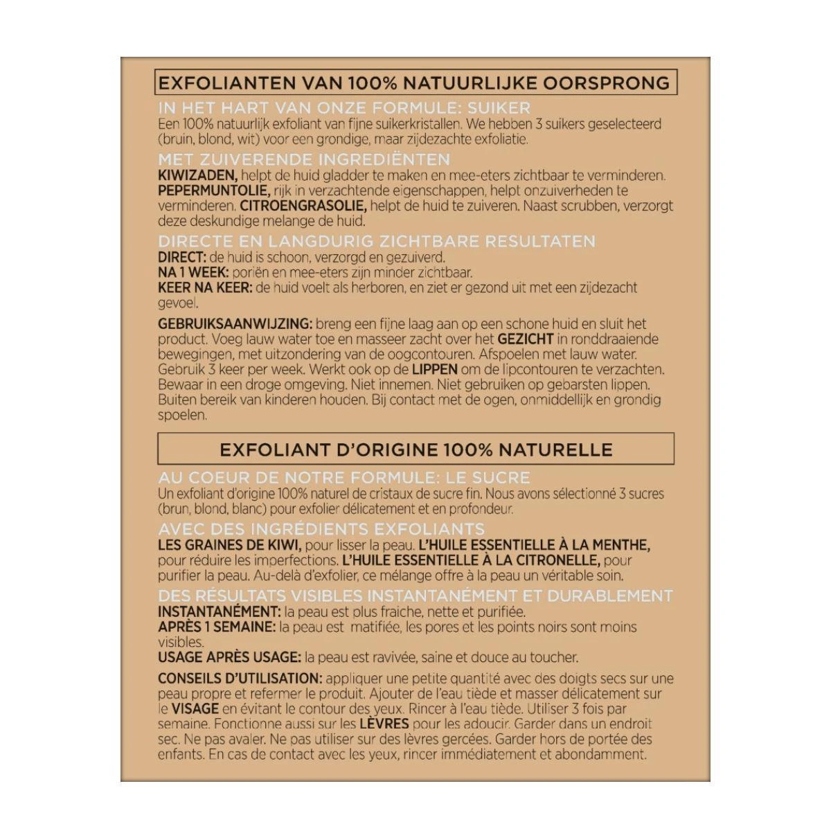 Ontdek de nieuwe formule van de zuiverende Sugar Scrub voor een verzorgde huid. Een 100% natuurlijk exfoliant van drie soorten fijne suikerkristallen voor een grondige, zijdezachte exfoliatie. Sugar Scrubs is verrijkt met kiwizaden en verzorgt het huidoppervlak, verheldert de huid en beschermt tegen dofheid.