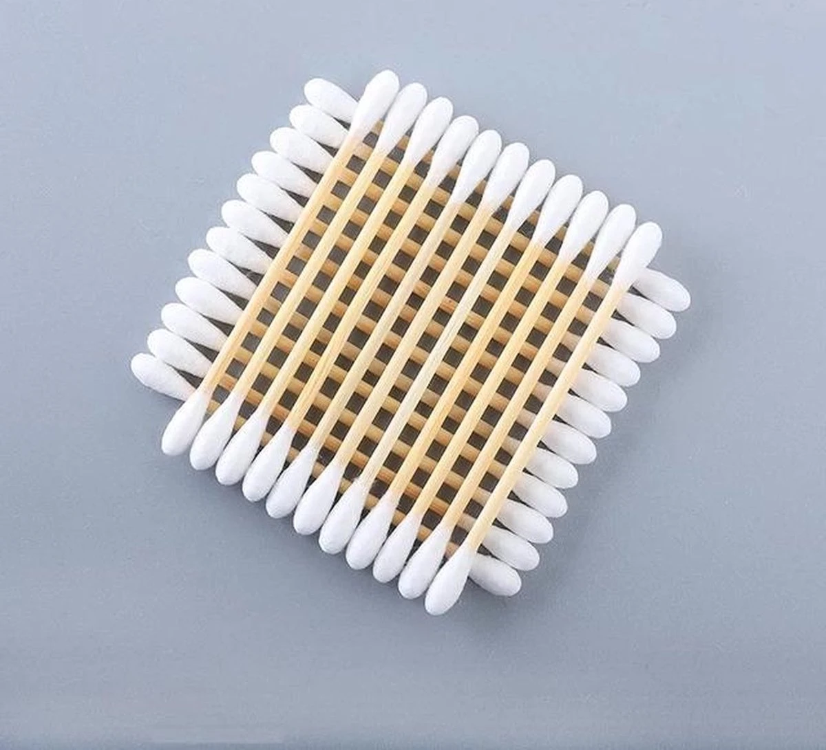 In deze verpakking zitten 1000 houten wattenstaafjes.