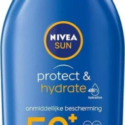 NIVEA SUN Protect & Hydrate Zonnemelk Travelsize biedt zeer effectieve UVA/UVB bescherming en beschermt onmiddellijk tegen zonnebrand en vroegtijdige huidveroudering. De verzorgende formule beschermt de huidbarrière tegen uitdroging en is water restistent. In handig travelsize formaat. De nieuwe en verbeterde formule respecteert de oceaan met een formule zonder Octinoxate, Oxybenzone en Octocrylene UV Filters. Vertrouw op het No.1* merk in zonbescherming.